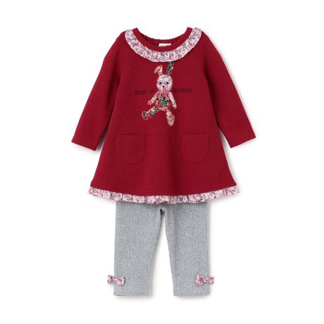 あらゆる部分にリバティファブリックのプリントをあしらった華やかなワンピースとレギンスのセットです。