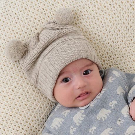 クマのお耳のようなポンポンがかわいい帽子です。