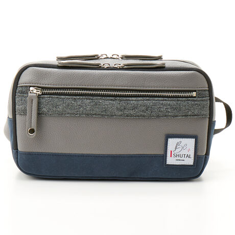 スウェード調合皮・ソフトなシボ感合皮・デニム風合皮の3素材を組み合わせたヒップバッグです。デザインのアクセントに金属ファスナーを採用し、引手は手に馴染むオリジナル仕様。前ポケットはマチ付き構造で、ファスナーポケット、オープンポケット、メッシュポケット、メッシュファスナーポケットを備え、小物を整理しやすく設計しました。メインルームにはウレタンポケット、オープンポケット、ファスナーポケット×2を搭載。背面は軽量化と通気性を意識したメッシュ仕様で、サイズ調整が簡単なバックル付きテープを装備しています。