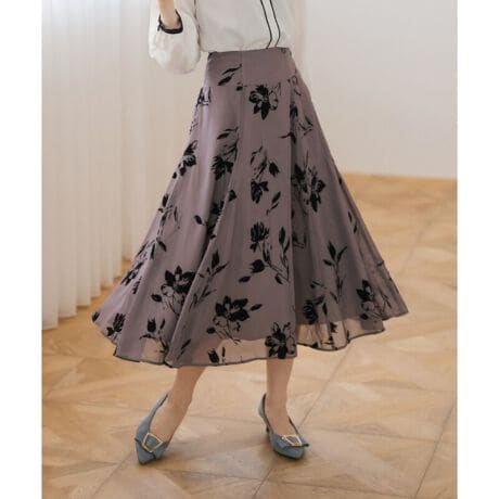 ・手触りの良いフロッキーフラワー柄が描かれたスカートで、歩くたび揺れるフレアシルエットが上品で女性らしい印象を演出。