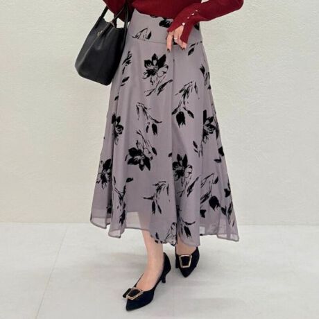 ・手触りの良いフロッキーフラワー柄が描かれたスカートで、歩くたび揺れるフレアシルエットが上品で女性らしい印象を演出。