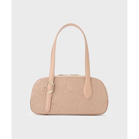 大ぶりの葉っぱとフラワー柄が目を惹く、長めのハンドルをつけたボストン型バッグ。ペットボトルや折り畳み傘、長財布が横にすっぽり入るトレンドの横長シルエット。肩掛けで持つことで脇にスマートに収まり、容量がありつつも大きく見え過ぎず、女性らしく合わせて頂ける一品に仕上げました。底鋲付きなのも嬉しいポイントです。