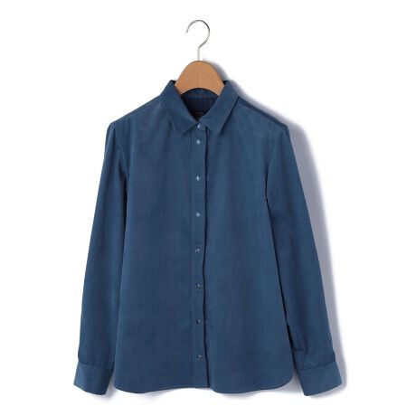 極細コーデュロイで仕立てた秋冬シーズンらしい長袖ブラウス。通常のコーデュロイと比較すると少し薄手のシャツコールは柔らかくしなやかで着心地抜群。光沢のあるスナップボタンがデザインアクセント。ゆとりのあるシルエットで、重ね着コーディネートにもぴったり。シンプルなデザインで様々な着こなしで重宝します。