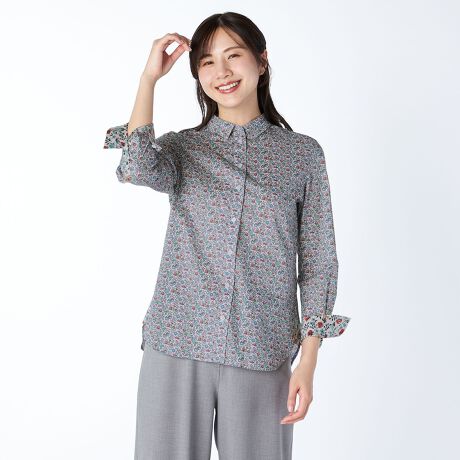 リバティプリント柄が華やかなデザインの長袖ブラウス。細かなフラワープリントが目を惹く一枚。カフス裏地と剣ボロ部分には異なるデザイン柄生地をあしらい、袖先を折り返すとより華やかなスタイリングに。お手持ちのボトムに合わせるだけで、スタイリッシュなお出かけコーディネートが完成するアイテムです。