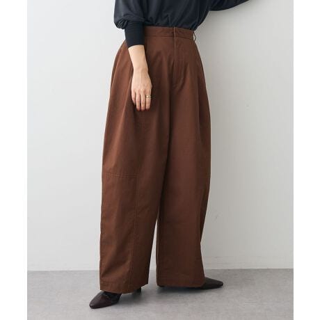 *すっきりとしたワイドシルエットで、脚のラインをきれいに見せてくれるカーブパンツ。シンプルなトップスを合わせるだけで大人っぽい印象に仕上がります。程よい光沢感とハリのあるツイル素材を使用し、シルエットを立体的に見せるカーブデザインが魅力。