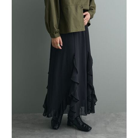 *揺れるラッフルで女性らしさを引き立てるロングスカート。裾にかけて広がるラッフルデザインが、歩くたびに自然な動きを生み出す一枚です。