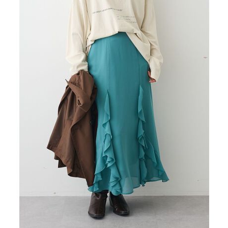 *揺れるラッフルで女性らしさを引き立てるロングスカート。裾にかけて広がるラッフルデザインが、歩くたびに自然な動きを生み出す一枚です。