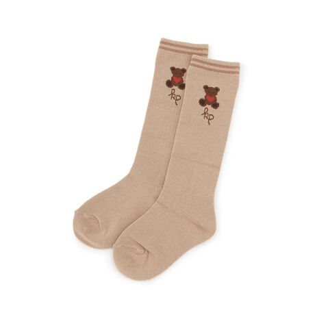ハートを持ったくまのワンポイントの編み込みが入ったハイソックスです。スカートやキュロットを穿いた足元に、さりげなく可愛らしさを添えてくれます。