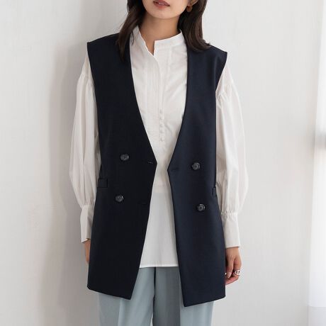 すっきりとしたノーカラーVネックデザインとダブルボタンのデザインがアクセント。衿ナシだから、どんなインナーとも相性がいいんです。