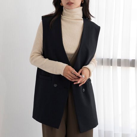 すっきりとしたノーカラーVネックデザインとダブルボタンのデザインがアクセント。衿ナシだから、どんなインナーとも相性がいいんです。