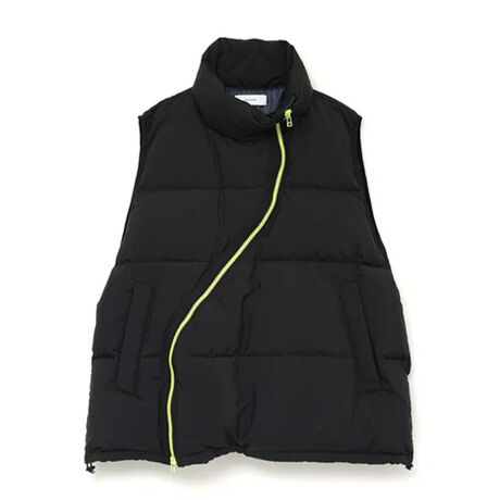 フロントに大胆なカーブファスナーを配したダウンベスト。