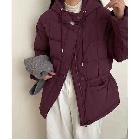 ウエストをきゅっと絞れるデザインが魅力のフード付きダウンジャケット。