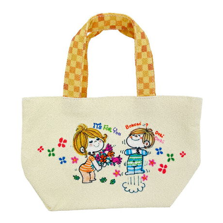 水森亜土のミニトートバッグです。小物を入れるのにぴったり◎年代問わずお使いいただける可愛いデザインなので亜土ちゃん好きにはたまらない〜♪ぬいぐるみに持たせても可愛いのでぬい活にもgood◎プレゼントなどにも喜ばれそうです☆彡