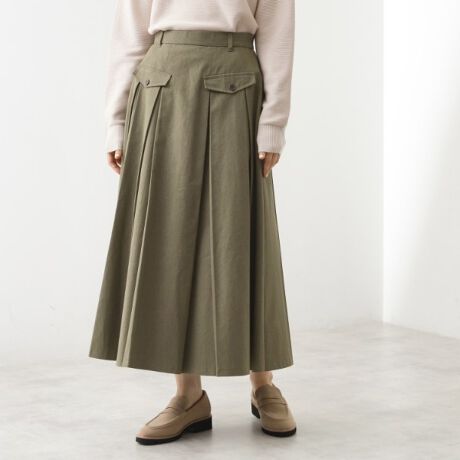 ヴィンテージライクなツイル素材を使用したタックスカートは、ワーク感を残しながらも、スッキリとしたキレイめカジュアルスタイルを実現します。