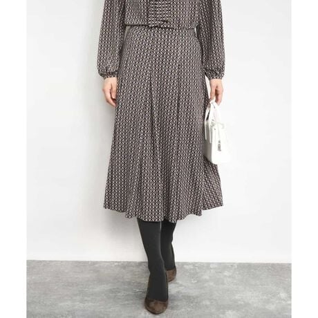 格子状に並んだスクエアがきちんと感のある幾何柄のフレアースカート。ジャージー素材なので程よい落ち感があり、広がりすぎないシルエットも好印象。