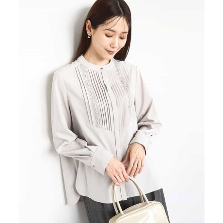 フロントにピンタックとレースを施した一枚でも存在感抜群のブラウス。きれいめに着こなせるよう比翼仕立ててでシルエットにもこだわりました。