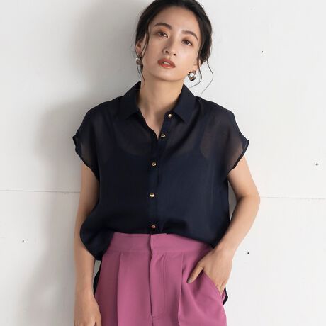 適度にハリのある素材はさらりと肌離れが良く、透け感が涼し気にスタイリングを演出します。肩を絶妙に覆うセミフレンチスリーブは、腕をほっそり、上半身をコンパクトにまとめる効果も。前後差のある裾にはスリットを入れ、ウエストアウトにしてもきれいなラインがでるよう、丈バランスを考慮しました。小ぶりなゴールドボタンを組み合わせたルックスは王道の上品なきちんと感があります。同素材のスカートにインしたり、ゆるくサイドアウトしたり、着方でイメージを変化させて。