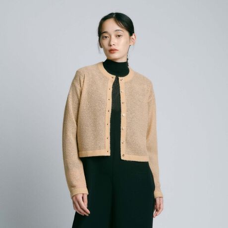 ツイード見えするループヤーンの編地が上質感を醸し出すシアーカーディガン。襟ぐり、袖口、裾のトリミングが?洗練された印象?を与え、特にブラックは白の配色がモード感をプラス。シアーな素材感でありながら、ツイード見えする上質な風合いがオンオフ問わず高見えする万能デザインです。