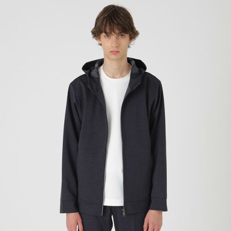 上品な光沢をもつウールジャージー素材を使用したジップアップパーカー。ブルゾンのような見映えでありながら、ジャージーならではのストレッチ性と軽さで、気軽に羽織ることができる一着です。メランジ調のカラーリングと程良いハリ感によりオトナなテイストのパーカーに仕上げています。フード裏にあしらったチェックや光沢感あるファスナーなど細かな部分にもこだわった一着です。