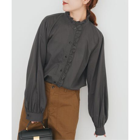 衿元から前立てに流れるフリルがさりげなく華やかさを添え、顔まわりを明るく演出します。たっぷりとギャザーを寄せたスリーブは、ふんわりとしたボリューム感がありながらも、落ち着いた印象に仕上げました。