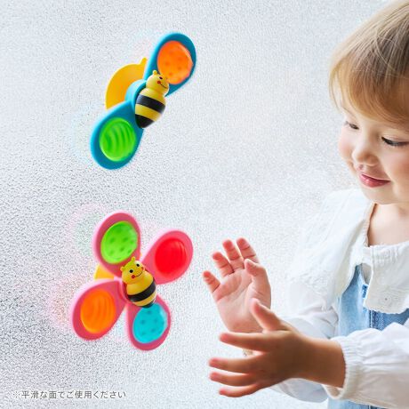テーブルやミラー、窓ガラスやお風呂の壁などにつけて、指でくるくる回したり、羽のぽこぽこを押して遊びましょう。