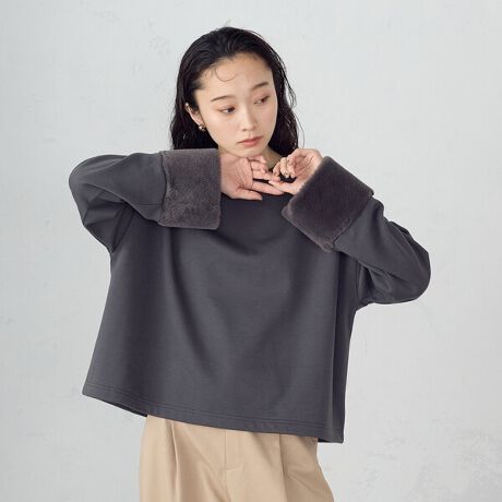 袖口のファー使いが印象的な異素材ドッキングプルオーバー。