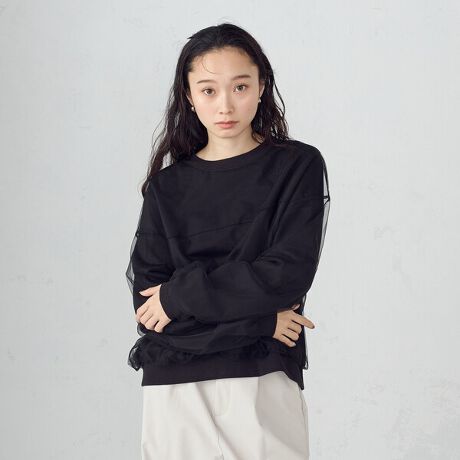 スウェットに華奢なチュールを重ねたデザイントレーナー。