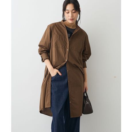 *大人のきれいめコーデに欠かせない「バンドカラーシャツワンピース」。ロング丈のチュニックデザインで、ワンピースとしても羽織りのロングシャツとしても活躍する万能アイテムです。