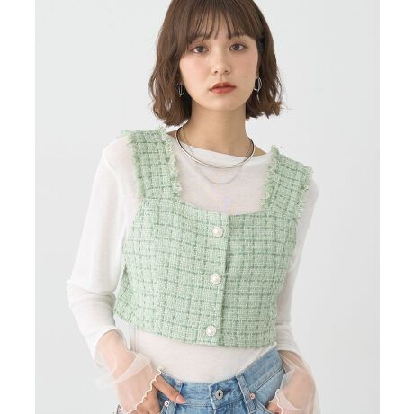 シーズンムードを高めるツイードビスチェ。肩紐のフリンジデザインやパールビジューボタンが上品でフェミニンな雰囲気を演出します。トレンドライクな短め丈がスタイルアップを叶えるおすすめの1枚。タートルネックニットやシアーカットソーなど幅広いレイヤードを楽しめるのも嬉しいポイントです。透け感[なし]