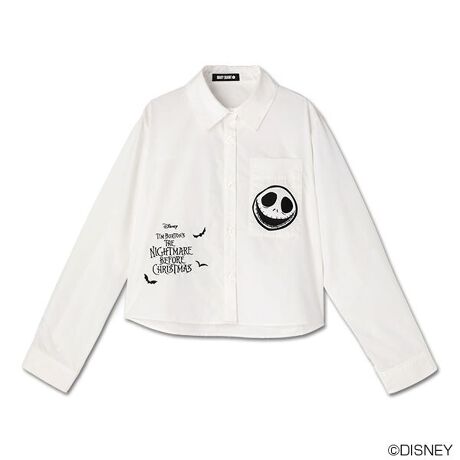 【MARY QUANT THE NIGHTMARE BEFORE CHRISTMAS DESIGN COLLECTION】大きなジャックの刺繍が特別感あるシャツブラウス。◆ポイント・左胸ポケットにジャックの刺繍・左裾にナイトメアロゴ刺繍・BACKヨークにロゴ刺繍・短め丈のボックスシルエット◆コーディネートモノトーンコーデに。パンツでクールにも、スカートで甘辛MIXなスタイルにも。リボンスカーフを合わせるのもおすすめです。[型番:225-103800]