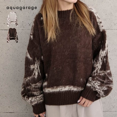 やわらかな色合いと独特のニュアンス柄が印象的な、女性らしいニットトップス。