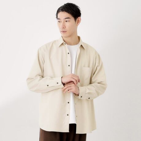 シンプルな無地デザインで、秋口の羽織りアイテムとして活躍する長袖シャツ。