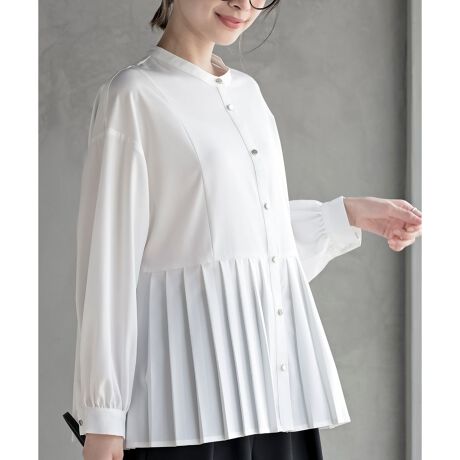裾をプリーツで切り替えた華やかな雰囲気のブラウス。