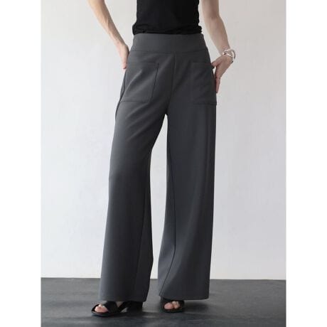 Agaご好評の、大きめのフロントポケットがポイントになったワイドパンツ。レッグラインを拾わない、すっきりと美しいシルエットが人気高い理由の一つ。ウエストは後ろのみゴム仕様でイージーな履き心地をキープしながら、前はフラットに仕上げることでショートトップスやタックインスタイルも綺麗なシルエットを保ち着用可能です。