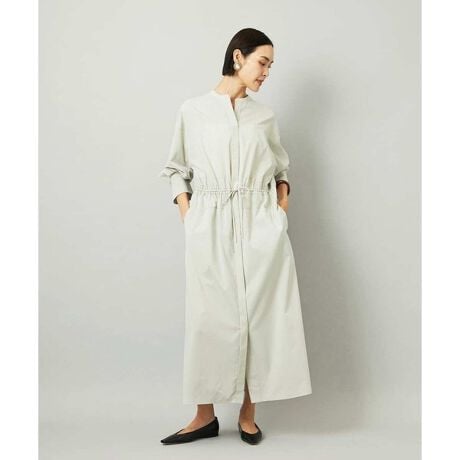 オーバーサイズシルエットのシャツワンピース。パーツごとに柄の向きを変えることで、ウエストの切り替えが立体感を演出します。ドローストリングでシルエットの調整も可能。衿ボタンを外して袖をラフにまくり、ニットジレに合わせれば抜け感のある着こなしに。さらに季節が進めばタートルインナーを重ねられるなど、レイヤードのしやすさから長く活躍する一着です。
