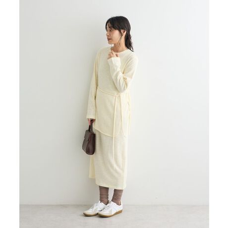 表面感のあるタオル調素材を使い、ラップ風のデザインでさりげなくウエスト位置を高く見せてくれるワンピースです。