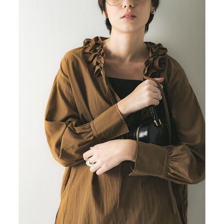 ネックラインのフリルは甘すぎず、大人の着こなしにぴったりです。