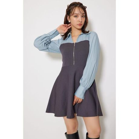 【キレイも可愛いも叶うドッキングKnitOP】【Design】少し大きめのシャープな襟がポイントのシャツをレイヤードしたように見えるニットミニワンピースです。フロントの金属ZIPがモードカジュアルな印象を演出。フレアのボリュームは幼い印象にならないよう絶妙な分量で作成しました。ブラウスの肩幅を内側に設定し華奢見え効果も叶えます。袖もボリューム感も損なわないよう、OUTERの気安さも考え作成したので様々なアウターとの合わせが可能です。【Color】定番のBLK×WHT(シャツ)、柔らかい印象のBRN×WHT(シャツ)、カジュアルライクなBLU×L/GRY(シャツ)の3色展開です。■透け感:なし■光沢感:なし■伸縮性:シャツなしワンピースあり■裏地:なし