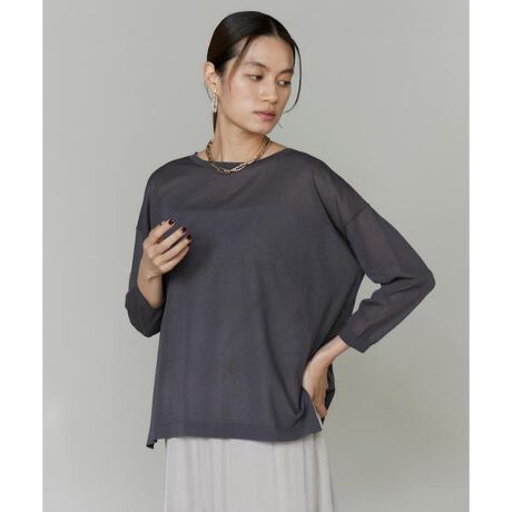 ■デザインたっぷりとしたサイジングで1枚でもこなれ感を演出できる大人のシアーニット。衿ぐりは程よい開きのボートネックでスッキリとした印象に、袖付けをドロップショルダーにすることで抜け感を演出しています。また、深めのサイドスリット入りのデザインなので、裾のアレンジが効き様々なコーディネートを楽しんでいただけます。■素材植物のセルロースを原料とした再生繊維のレーヨンと、軽く耐久性に富んだナイロンを撚り上げた繊細で高級感のある素材です。適度なドレープ感とドライタッチで清涼感のある風合いが特徴で、編み目の大きさを調整することにより適度なシアー感を表現しました。・水洗い可■サンプル撮影商品画像の商品はサンプルです。実際の商品とはサイズや色味、素材、デザイン等の仕様が若干変更になる場合がございます。■カラーについては、可能な限り実際の商品に近いカラーで撮影をおこなっておりますが、照明の関係により実際の製品とは色味が違って見える場合があります。またパソコン・スマートフォンなどの環境により、若干製品と画像のカラーが異なる場合もございます。現物と画像のカラー差異については返品理由となりませんので、予めご了承ください。■サイズ表記はあくまで目安となります。