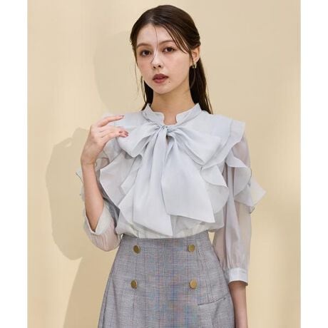 【上品なシアー素材で大人レディに仕立てる2WAYボウタイブラウス】【Point】・一枚で簡単に着映える王道の大人フェミニンブラウス。・ボウタイは取り外し可能な2WAY仕様。・フェミニンなボウタイデザインと、リボンを外すと大人っぽいスキッパーデザインと印象を変えた着こなしが楽しめます。・身頃部分は裏地を付けており、インナーを気にせず一枚で着用が可能です。袖の透け感が抜け感を演出します。【Fabric】肌触りがさらっとして、とてもソフトな生地を使用しております。身頃部分には裏地を付けているので、インナーを気にせず安心して着用いただけます。シワになりにくい素材になっており、ご自宅での洗濯が可能なのでお手入れしやすいのも嬉しいポイントです。ケア方法:手洗い可能透け感:あり裏地:身頃部分あり伸縮性:なし光沢感:微光沢生地の厚さ:薄手