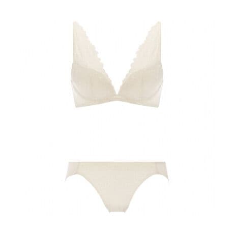 デコルテから肩ひもまでボタニカル調の繊細な編みレースをつなげ、レーシーですがアウターにひびきにくく、カップが小ぶりで華奢で軽やかに見えるデザインです。