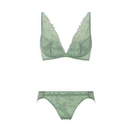 デコルテから肩ひもまでボタニカル調の繊細な編みレースをつなげ、レーシーですがアウターにひびきにくく、カップが小ぶりで華奢で軽やかに見えるデザインです。