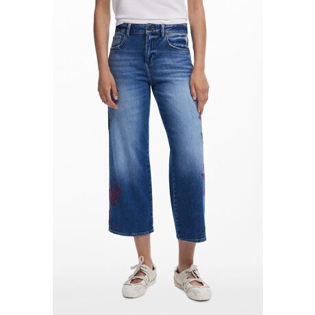 洗い加工と両脚に植物モチーフの刺繍が施された、キュロットカットのデニムパンツ。