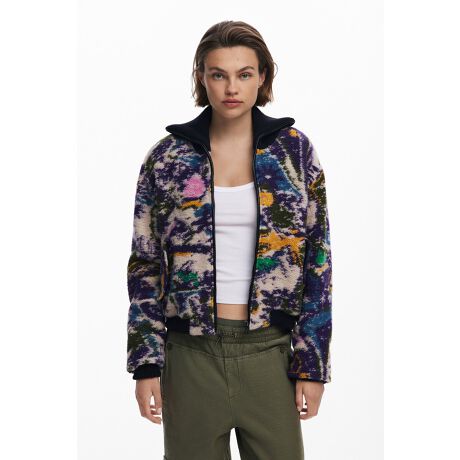 ニット襟とジッパー開閉の杢調仕上げのボンバースタイルのショートジャケット。