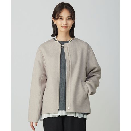 ■デザイン軽やかで使いやすいショート丈のノーカラーコート。ややコンパクトな肩回りとすっきりとしたボクシーシルエットに仕上げました。前開きファスナー仕様で、さっと羽織れて気軽に着られるもの嬉しいポイント。首元がすっきりとしたノーカラーデザインは、タートルネックなどのレイヤードにも映え、秋冬の着こなしをぐっと引き立ててくれます。リバー縫製ならではの上品な仕立てに加え、裏地をつけることでロングシーズン着られる仕様に。大人のスタイリングに取り入れやすいモダンで洗練された印象の1着です。背裏、袖裏あり。カラーは、柔らかな雰囲気のライトグレー(#003)、肌なじみが良いベージュ(#033)、洗練された大人の印象を与えるミッドナイト(#074)の3色展開です。