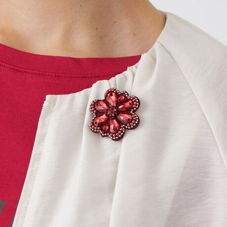 [型番:U1V09613__]塗装できれいに色を付けたなみだ型のパーツを中心に、極小プラパールやボールチェーンを使って、きりっとした花型のフェルトブローチを作りました。ジャケットの襟やニットの襟元、また帽子やバッグなど、色々な場所につけてお楽しみ下さい。