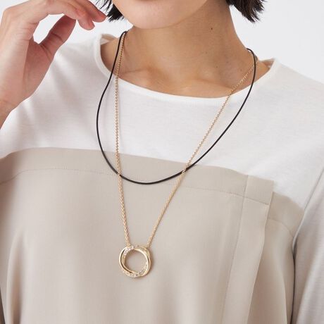 [型番:U1V06611__]リングにガラスビジューを絡ませて高級感を出した、ワンポイントネックレスです。附属にコットンコードもついており、シチュエーションに合わせて使い分けすることができます。