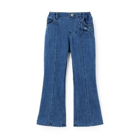 フェイクパールをあしらった飾りリボンが可愛いフレアパンツです。