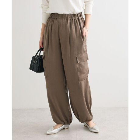 光沢のある上品な素材で仕立てたカーゴパンツ。お好みで裾を絞ってシルエット変化でき、着こなしに応じて自在にアレンジしていただけます。ウエストは総ゴムで楽な穿き心地なうえ、内側の紐でサイズ調節も可能。どんなトップスにも合わせやすく、デイリースタイルにぴったりなおすすめのアイテムです。透け感[なし]