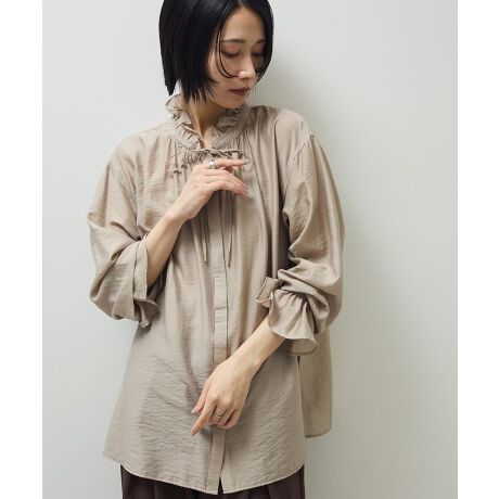 柔らかいハリ感のあるレーヨン混素材で仕立てたデザインブラウス。比翼仕立ての前たてや衿と袖口に合わせたフリルが上品で洗練された雰囲気を演出します。首元の細いリボンは結んだり垂らしたり、着こなしに応じてアレンジも自在。ジャケットやニットからフリルを覗かせたスタイリングもおすすめです。